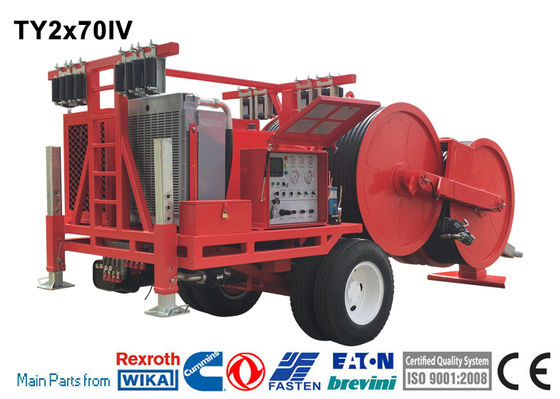 TY2x70IV Hydraulic Tensioner The machine allows for the tension stringing of four-bundle conductor of 630mm2 and below in mountainous and hilly areas, of twin-bundle conductor of 720mm2 and below in flat lands, and of conductor 720mm2 in various terrains; besides, it can be used for tension stringing of OPGW or ADSS optical cable and 500kV haulage rope in various terrains  |